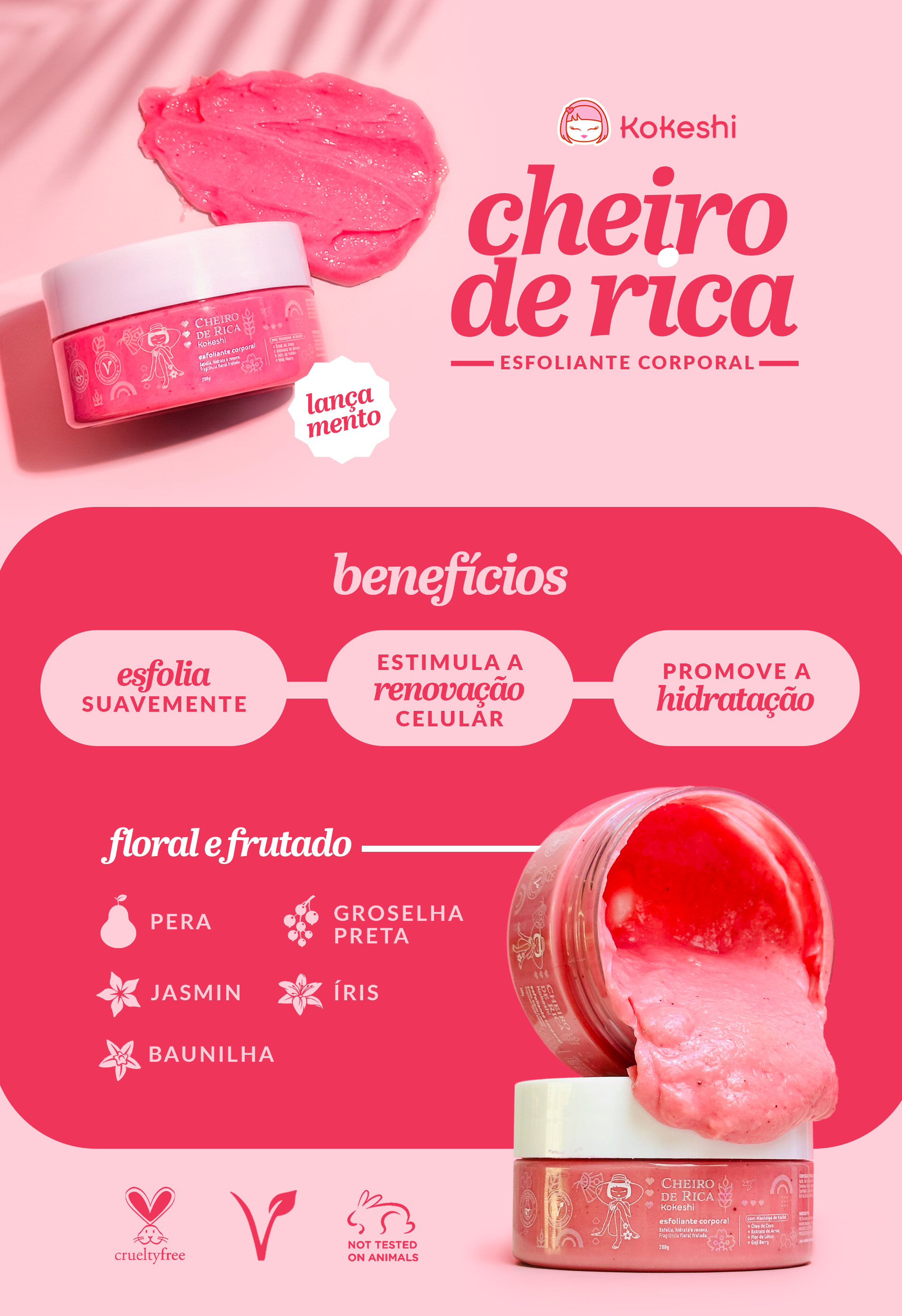 O Esfoliante Corporal Cheiro de Rica remove impurezas, estimula a renovação celular e devolve a maciez com um toque radiante. Sua fórmula combina a ação nutritiva do Óleo de Coco e da Manteiga de Karité, que hidratam durante a esfoliação, com os extratos de Arroz, Flor de Lótus, Orquídea e Goji Berry, ricos em propriedades antioxidantes e calmantes.