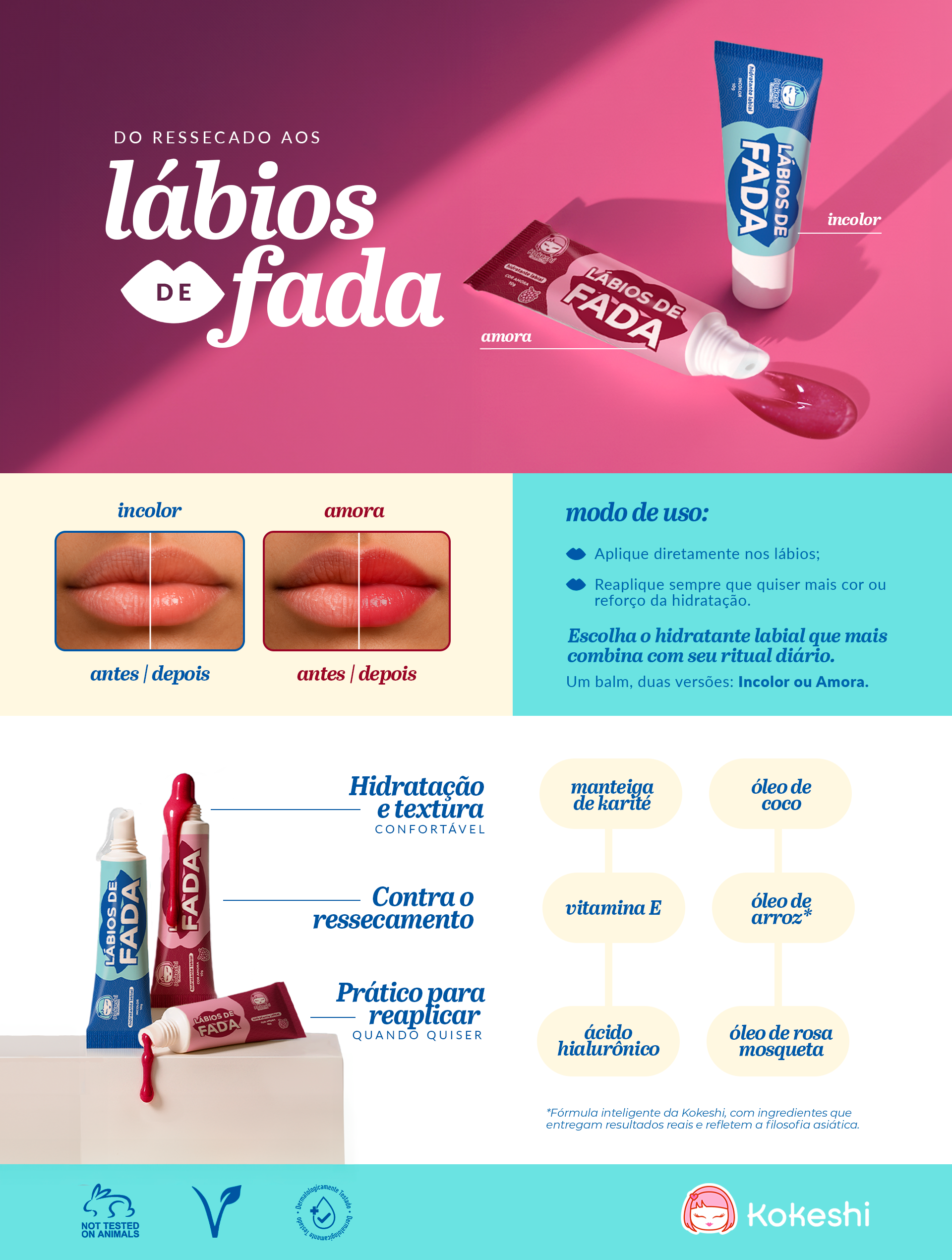 O Hidratante Lábios de Fada Kokeshi hidrata e nutre profundamente, deixando os lábios macios, com acabamento delicado e um sabor adocicado irresistível. Sua fórmula une manteiga de karité, vitamina E e óleos de arroz, coco e rosa mosqueta, em uma textura super confortável.